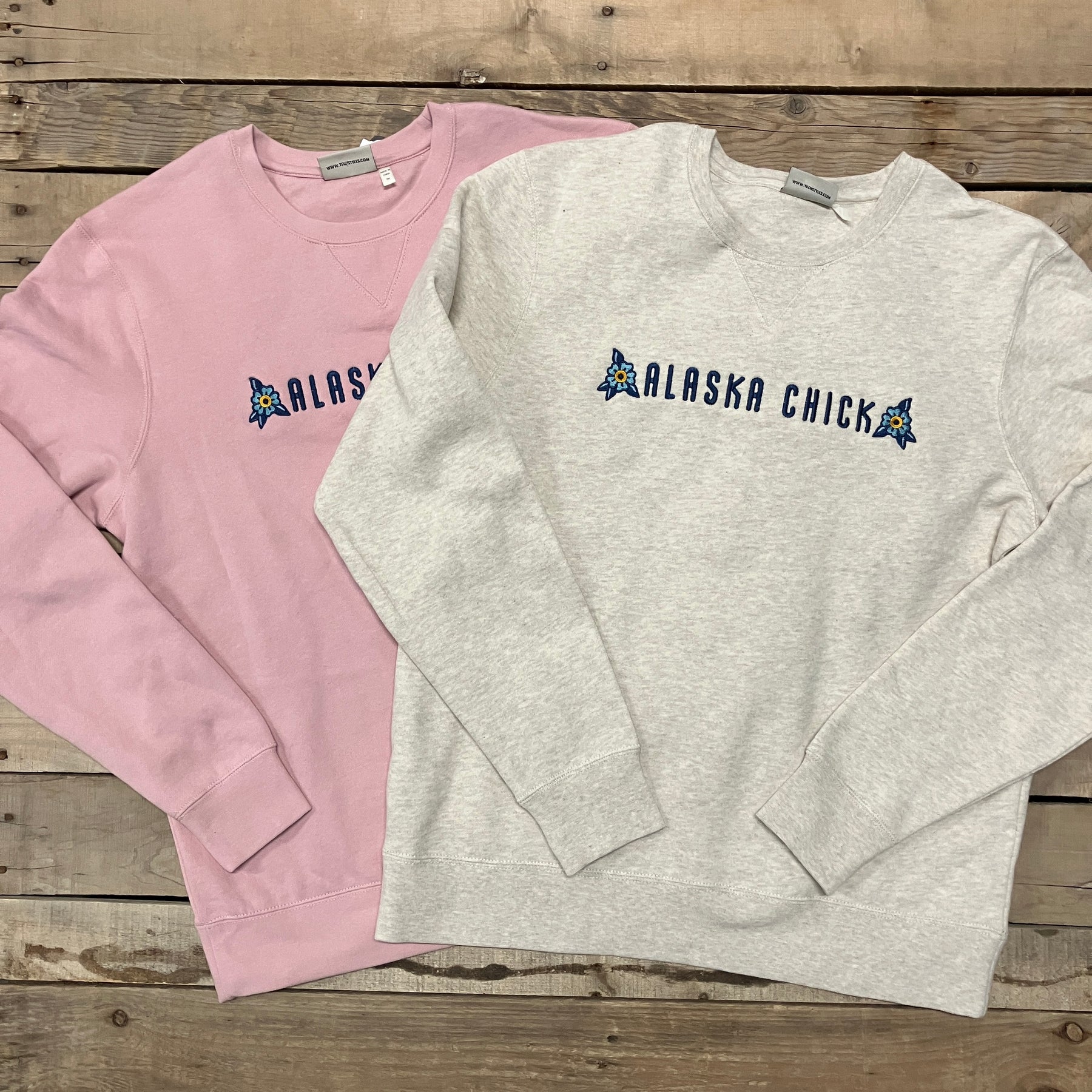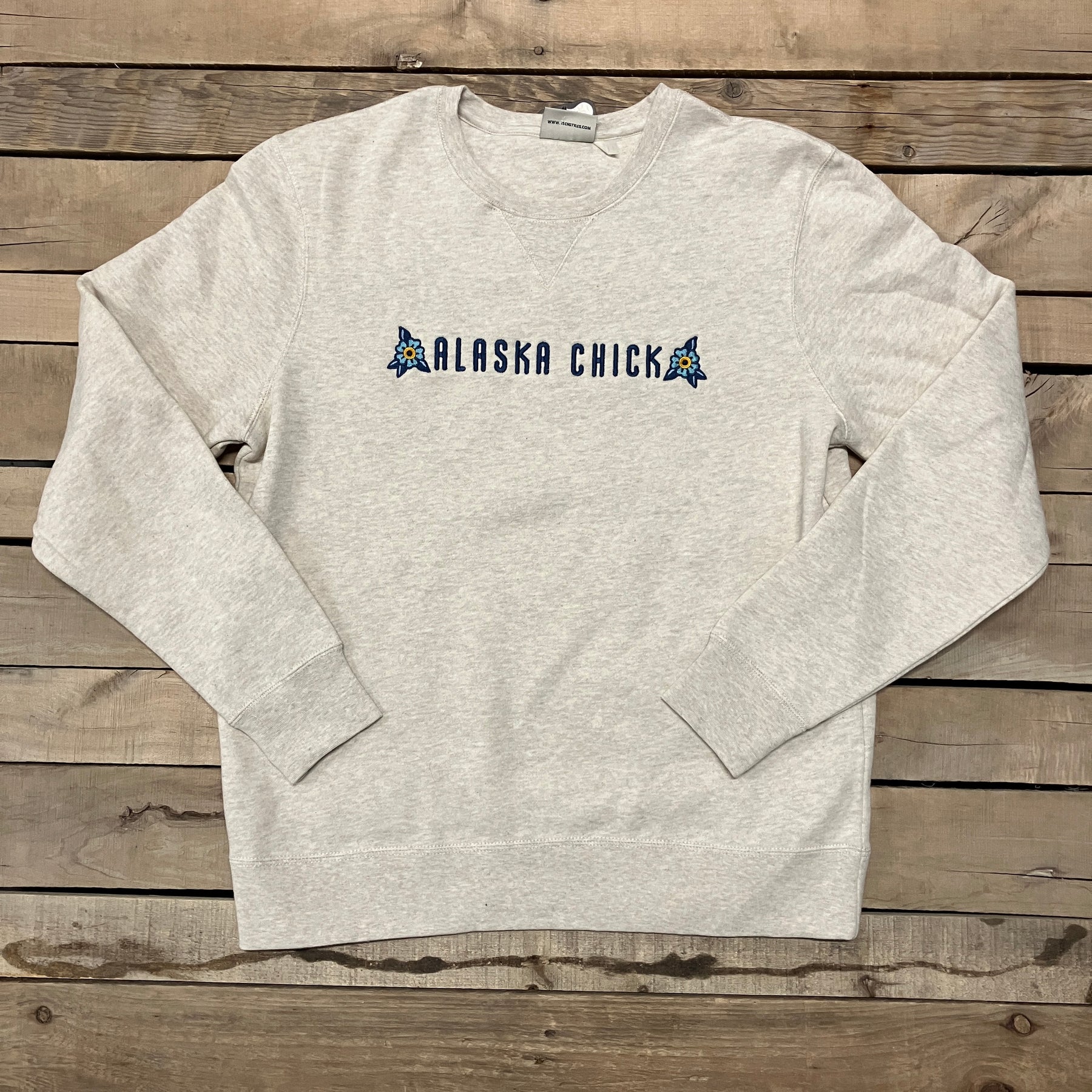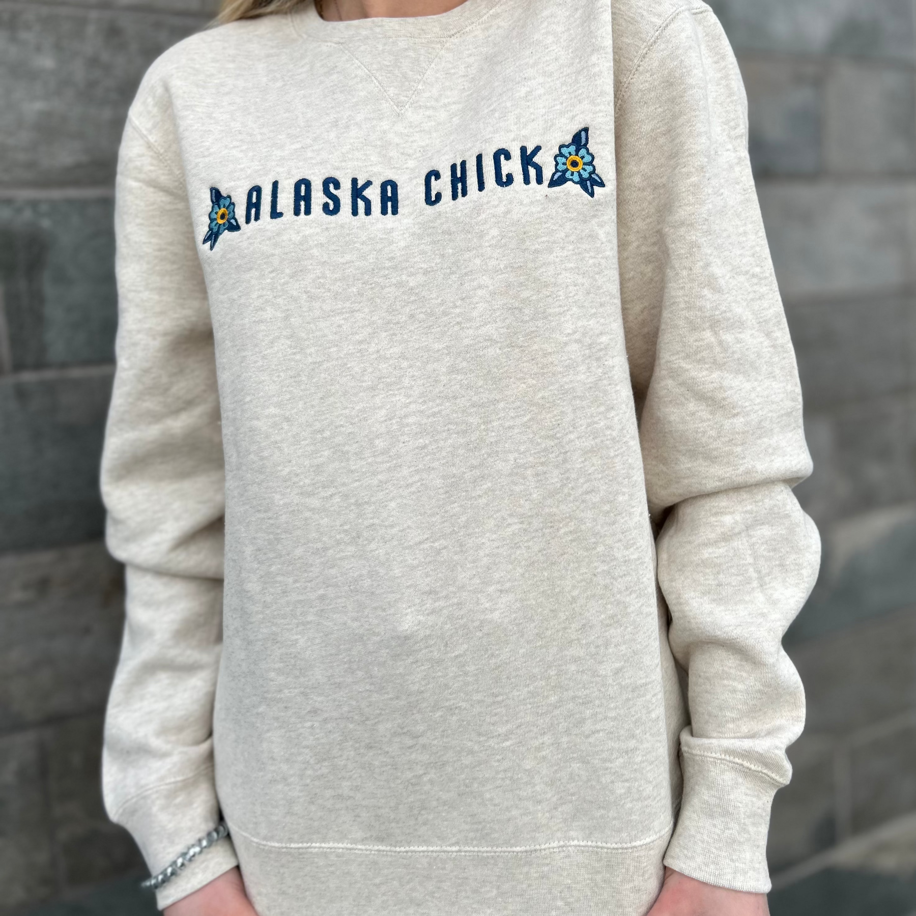 Embroidered Flowers and "Alaska Chick" on front